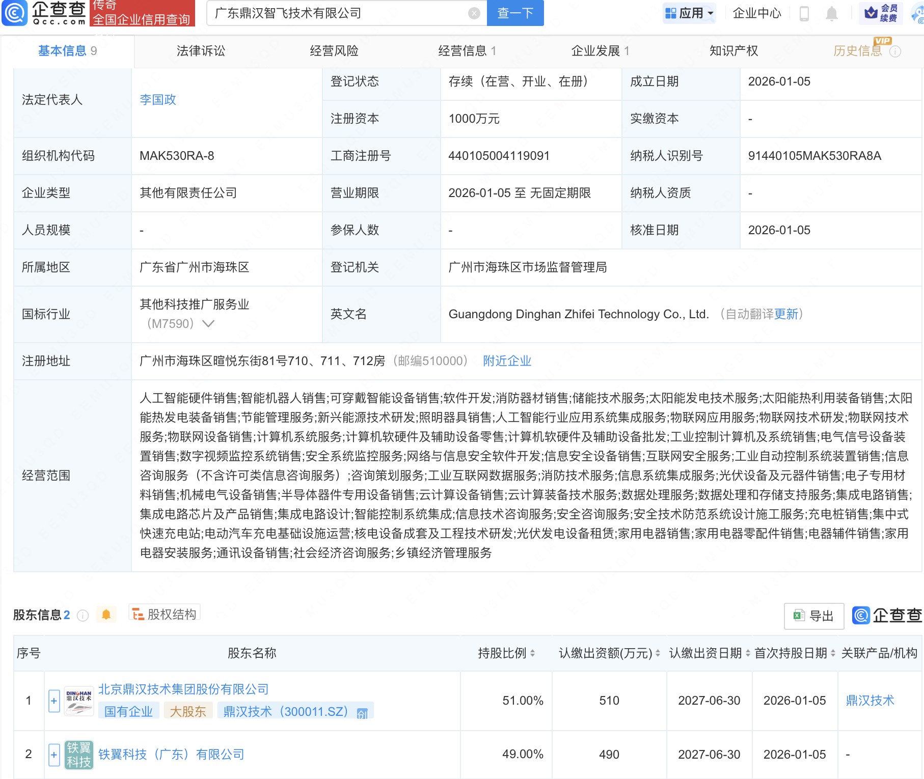 近日,广东鼎汉智飞技术有限公司成立,注册资本1000万元,经营范围包含:人工智能硬件销售;智能机器人销售;人工智能行业应用系统集成服务;物联网应用服务;集成电路芯片及产品销售等。企查查股权穿透显示,该公司由鼎汉技术(300011)等共同持股。