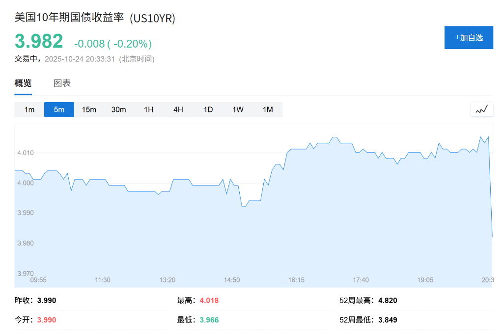美国国债收益率短线下挫,10年期国债收益率下行逾2bp,现报3.978%