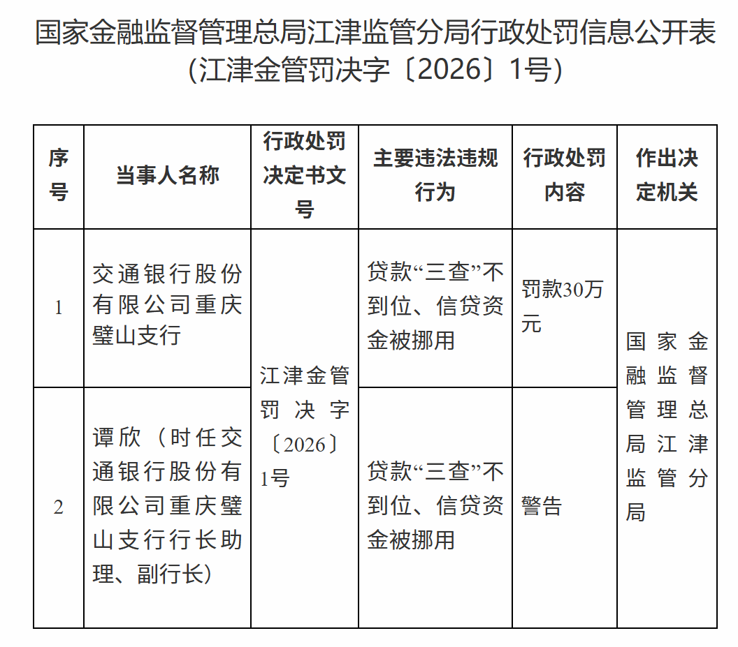 1月9日,国家金融监督管理总局江津监管分局行政处罚信息公开表显示,交通银行股份有限公司重庆璧山支行因贷款“三查”不到位、信贷资金被挪用被罚款30万元;谭某被警告。